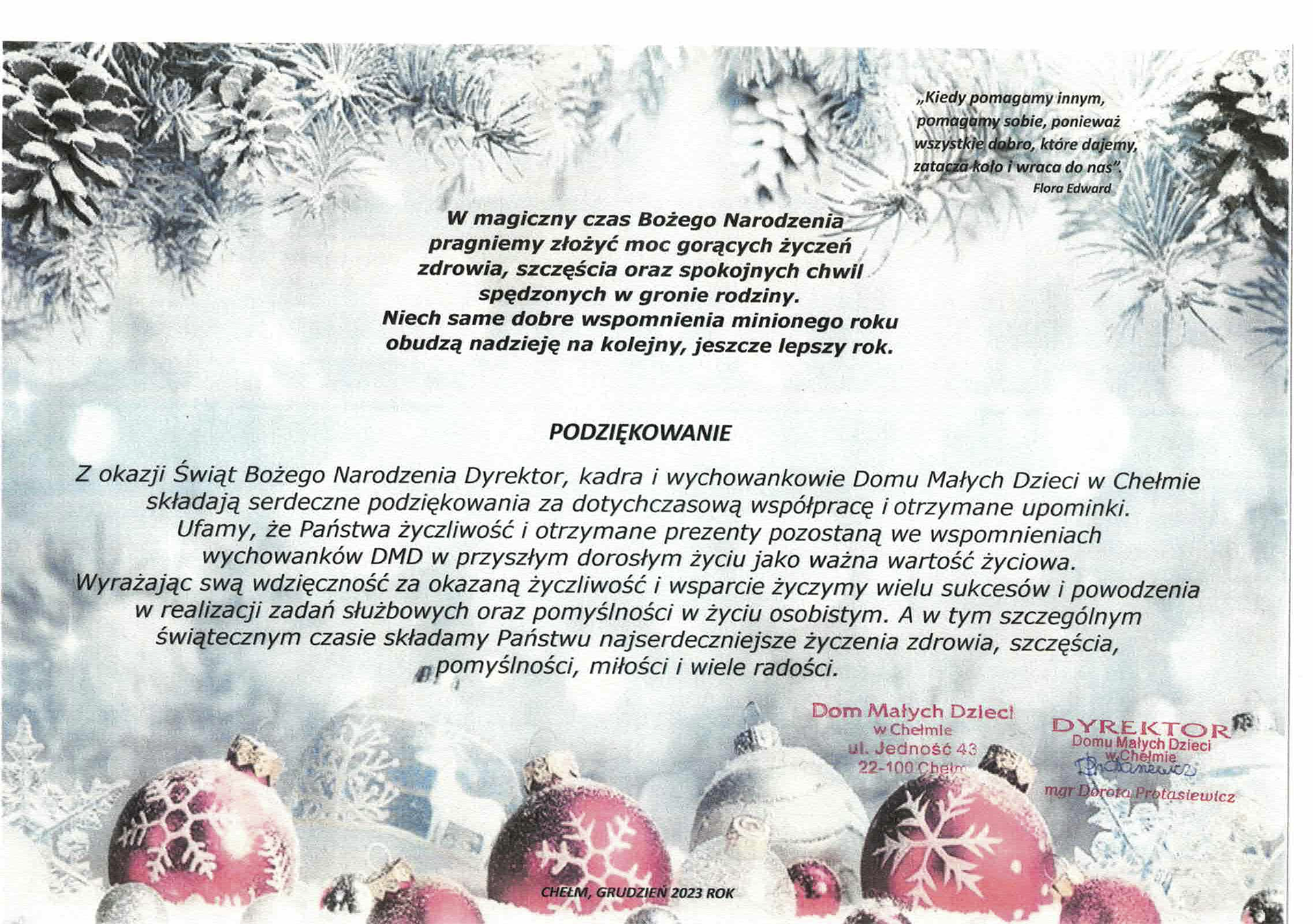 Z okazji zbliżających się mikołajek EkoPaliwa Chełm Sp. z o.o. postanowiła zadbać o te maluchy, które nie mogą doświadczyć ciepła rodzinnej atmosfery i radości związanej z przynależnością do rodziny. Listy napisane przez podopiecznych Domu Małych Dzieci w Chełmie rozpaliły w nas chęć spełnienia tych z pozoru przyziemnych marzeń, lecz dla maluchów stanowiących wielkie pragnienia. Nie było to jednak łatwe zadanie, ponieważ niektóre potrzeby były nietypowe, a na zdobycie wszystkich rzeczy było zaledwie 3 dni. Jednak dzięki zaangażowaniu pracowników i przy wsparciu finansowym Zarządu EkoPaliwa Chełm Sp. z o.o. wcieliły się w rolę Świętego Mikołaja z prawdziwego zdarzenia. 6 grudnia 2023r. przedstawiciele załogi w świątecznych czapeczkach odwiedzili podopiecznych DMD. Sama wizyty wzbudziła ogromne emocje. Radości było wiele, ale pojawiły się również łzy wzruszenia. Czujemy wielką satysfakcję, że przygotowane podarunki rozpaliły w oczach maluchów iskrę radości. Cieszymy się ich szczęśliwymi uśmiechami i tym, że razem z nimi możemy doświadczyć świątecznych cudów.